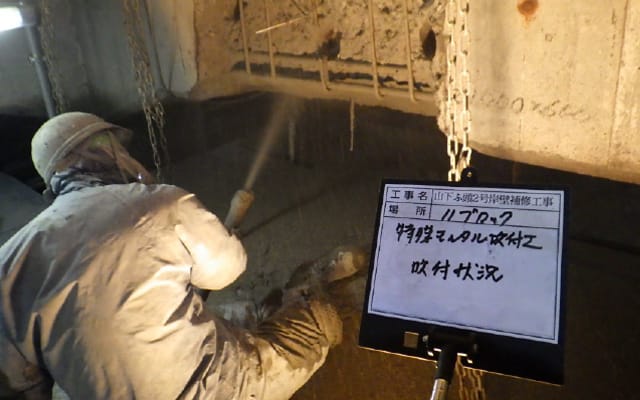 山下ふ頭桟橋においてコンクリート構造物の塩害による劣化部を特殊モルタル乾式吹付工法で補修・補強を行いました。乾式吹付工法は施工時間の限られた時間で効率よく確実に施工するのに適した数少ない工法の1つです。