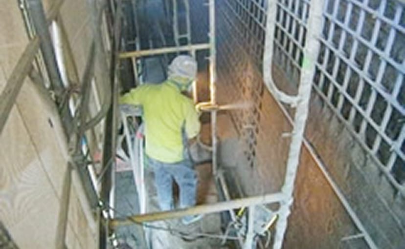 劣化したコンクリートを手バツリまたウォータジェットにより取り除きます。修復材であるポリマーセメントモルタルの付着の妨げとなる脆弱なコンクリートや表面のホコリも取り除きます。