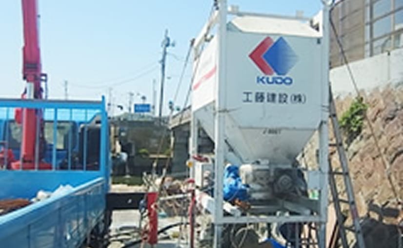 機械化により長距離・高所への材料運搬がスピーディに出来ます。プレミックスモルタルを使用。現場での配合作業がありません。鉄鋼取り付け・現場溶接・注入工等の作業がなくなります。