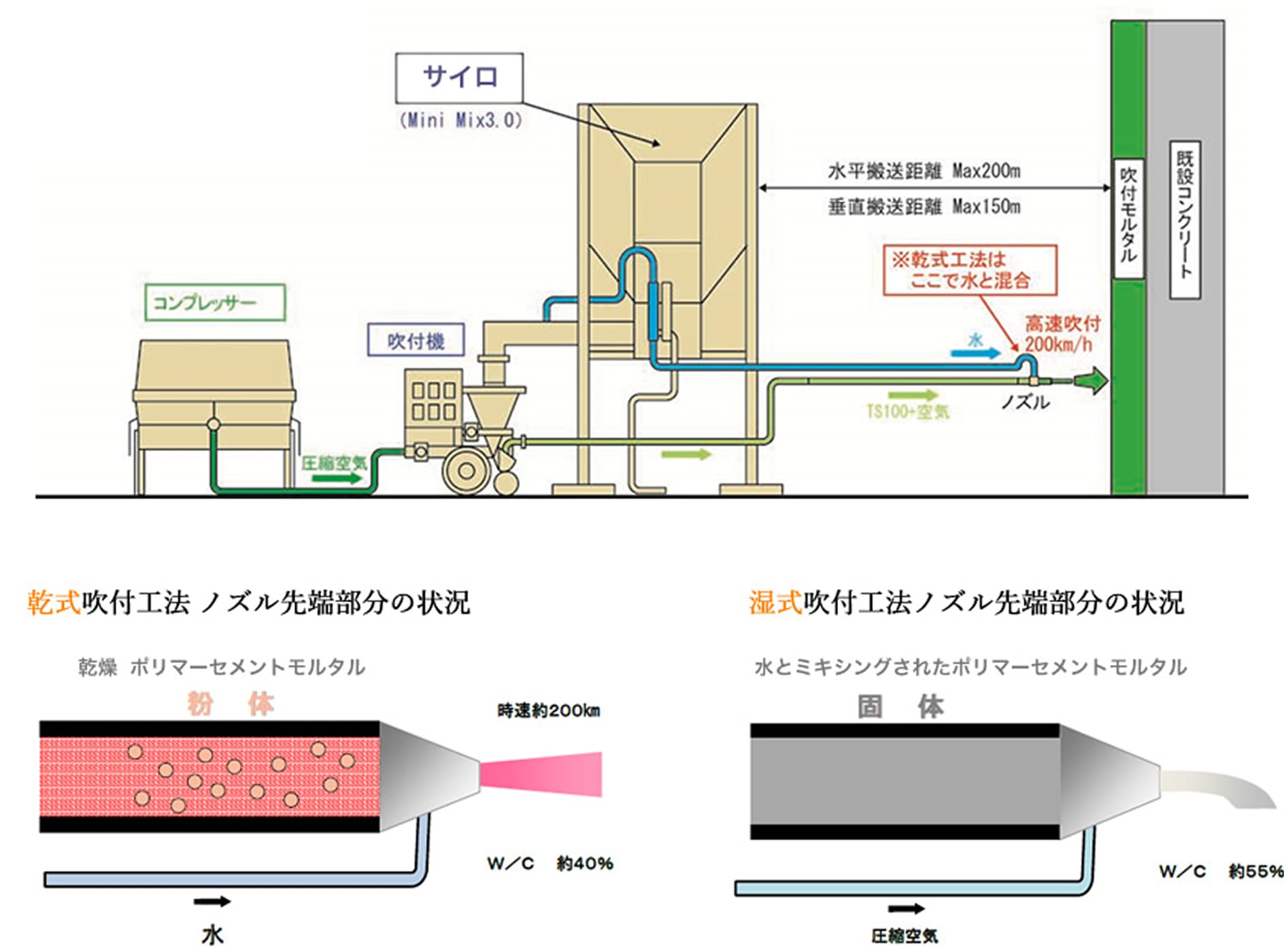 単位水量が少なく、高密度な吹付モルタル層を作り、中性化・塩害・凍害等に対して耐久性が格段に向上します。