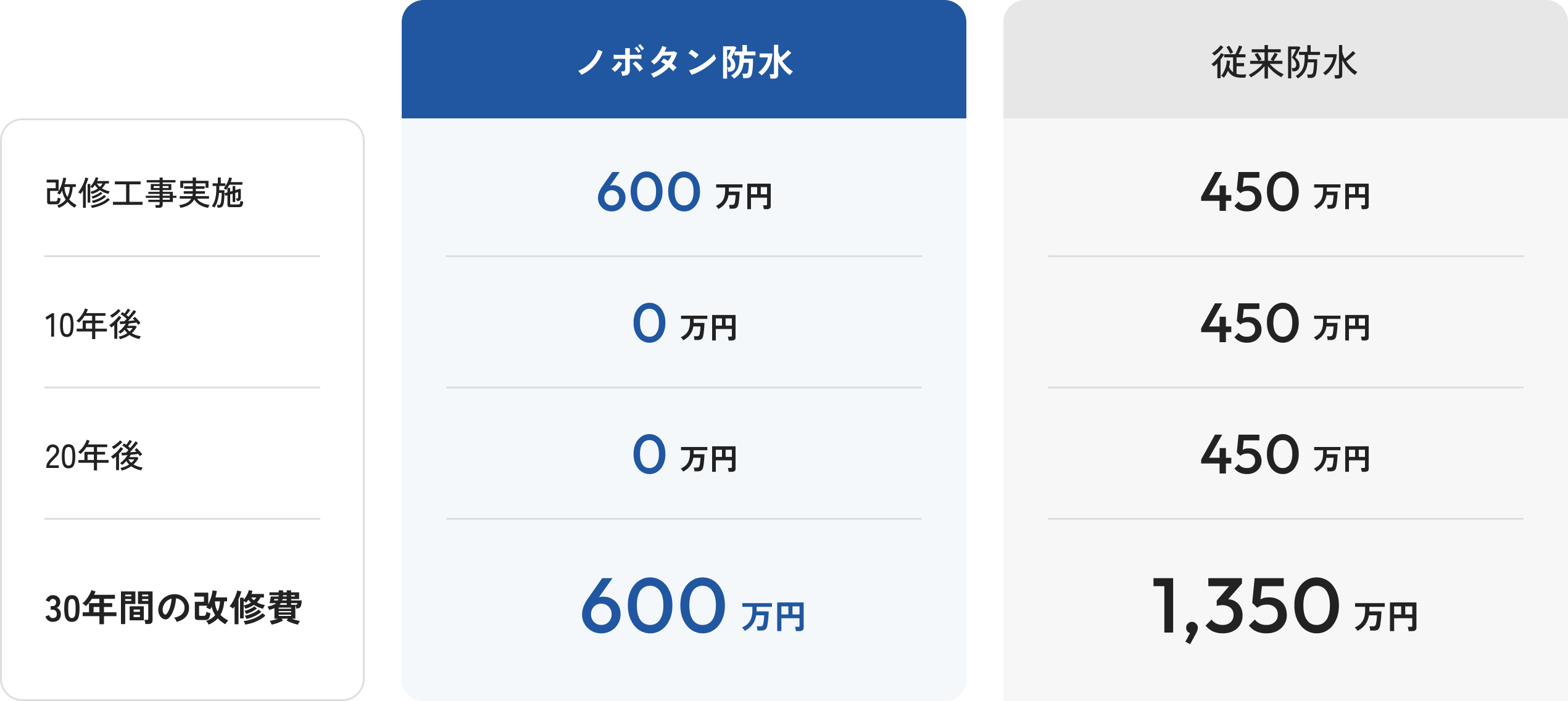 ノボタン防水システムは、高い耐久性で従来の工法に依る施工に比べ、30年のトータルコストで圧倒的なコスト削減になります。