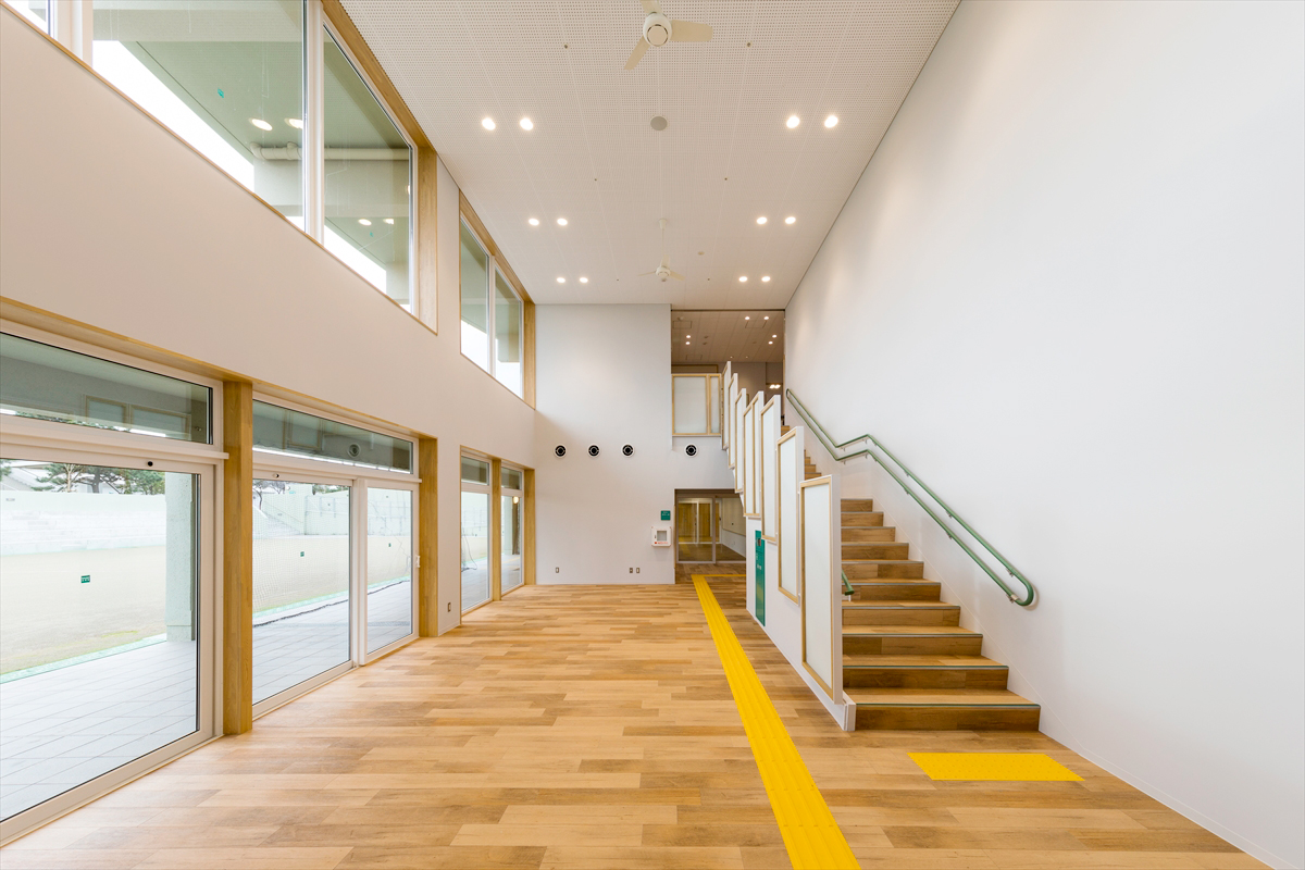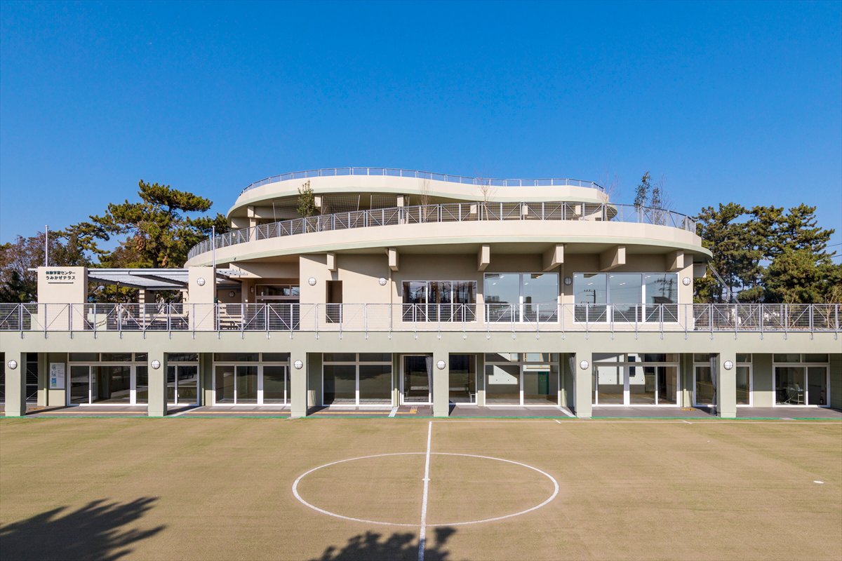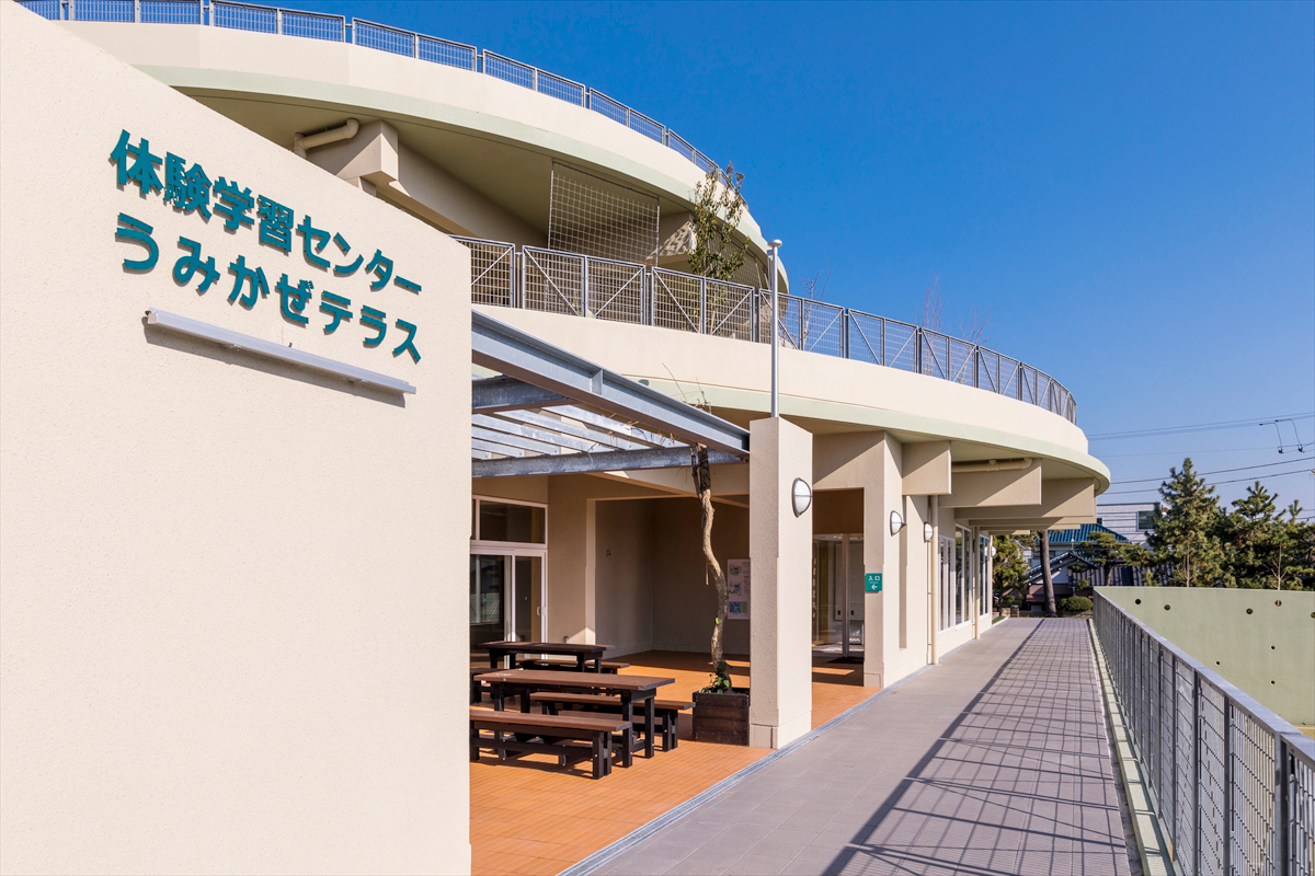 「茅ヶ崎公園体験学習センターうみかぜテラス」は青少年の自立心の育成と高齢者・障害者の健康や生きがいづくりをテーマに、あらゆる世代が交流できる施設です。また、海岸線に近い施設の為、津波発生時の一時退避場所の役割も兼ね備えています。施設内には、様々な体験学習ができる多目的室、音楽室、調理室、美術室などを設置。1階は、集会室や新オリーブ広場、2階は集会室や屋外活動が出来る「はまかぜ菜園」や「たまごの広場」など整備されています。