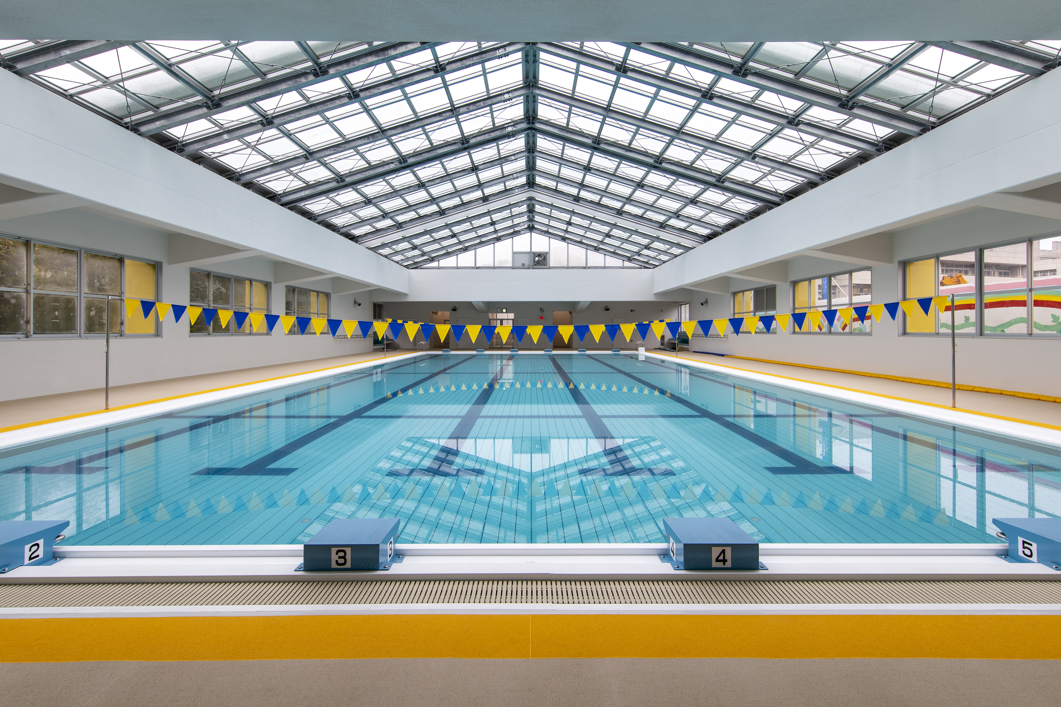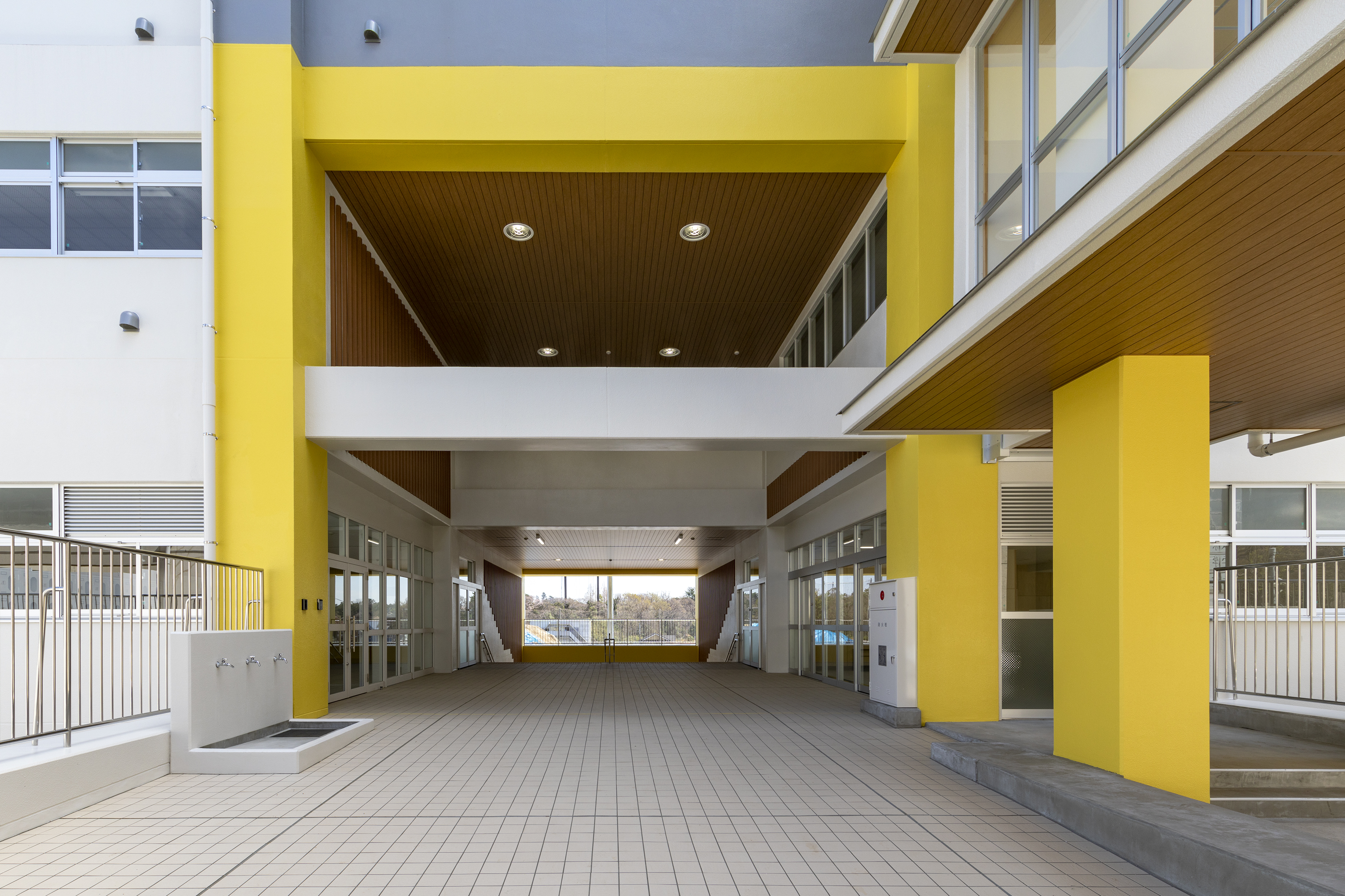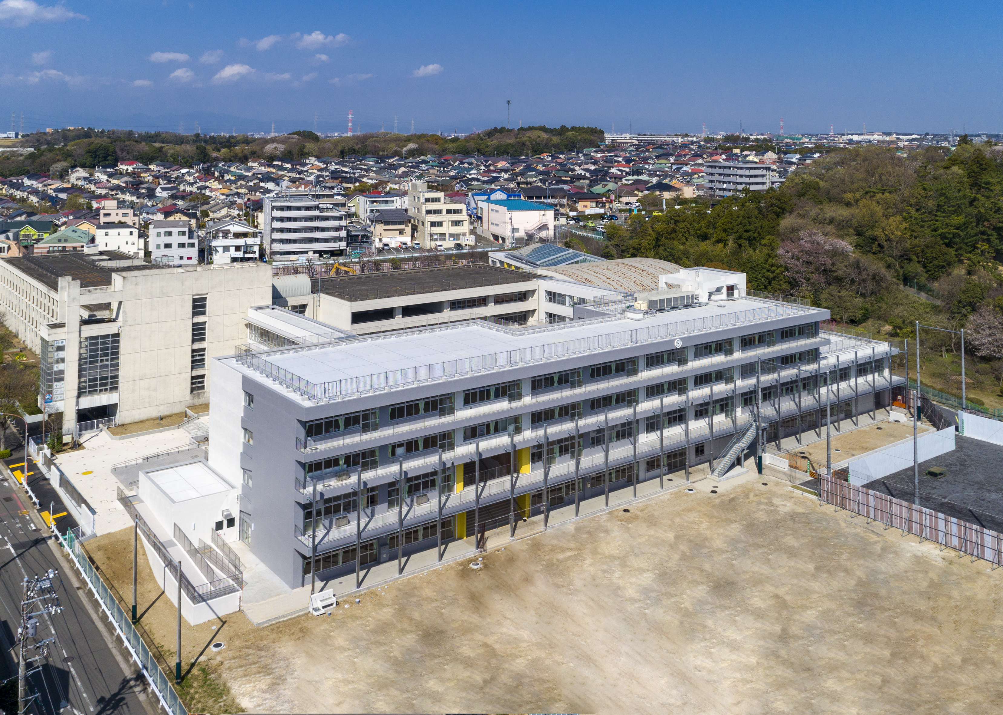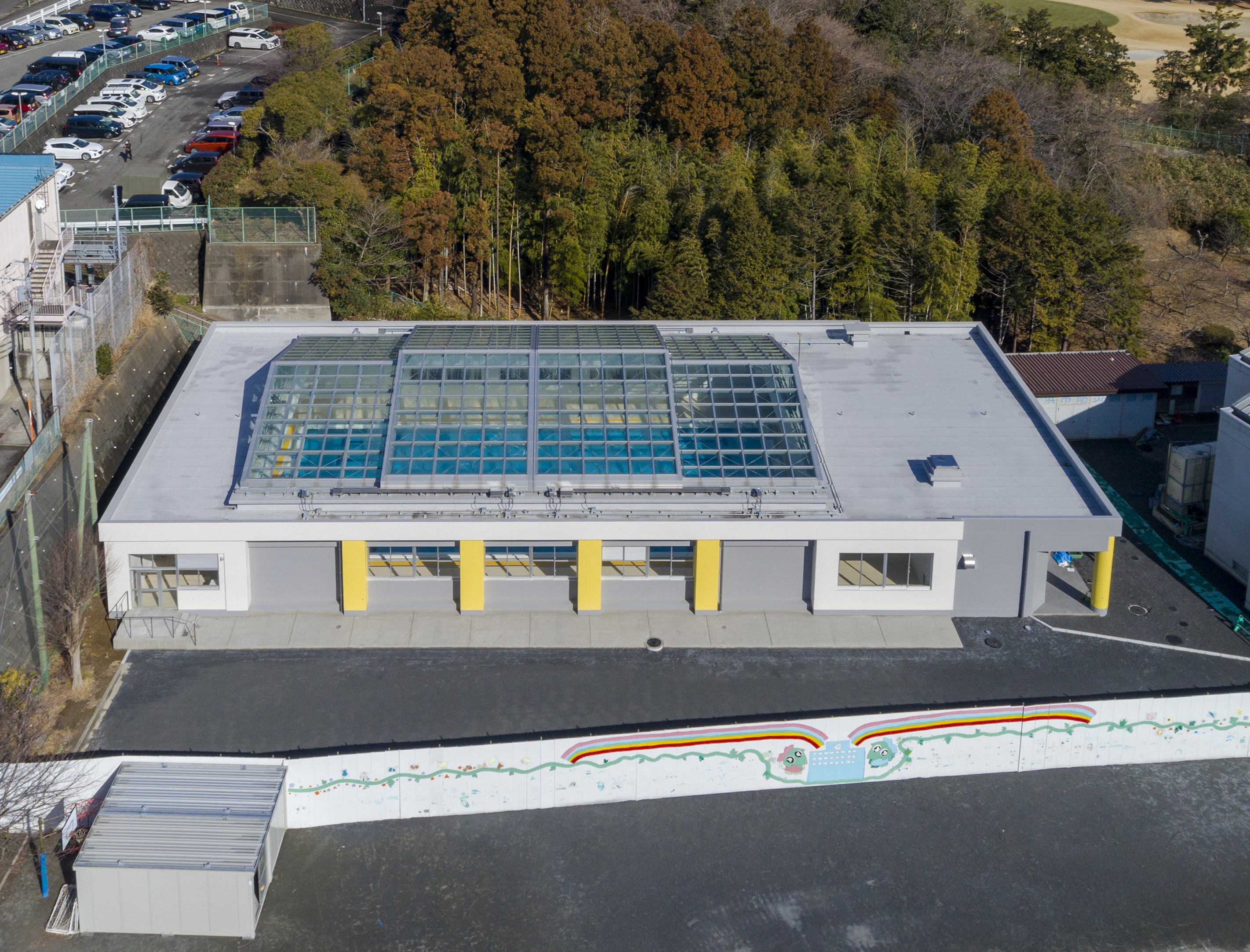 相鉄線「緑園都市駅」から徒歩13分程の場所に、横浜市では3棟目の義務教育学校として、令和3年3月に「緑園義務教育学校」が竣工致しました。義務教育学校は、小学校段階に相当する6年間の前期課程と、中学校段階に相当する3年間の後期課程による9年間一貫した教育を行う学校です。本工事は既存の緑園東小学校の校舎及び隣接する学校予定地を活用して建設され、令和4年4月の開校に向けて準備が進められております。第1工区は、主に後期課程で使用する校舎棟、プール棟となっています。プール棟は、可動式屋根と可動床が採用されたことで、利用時間が天候に左右されることなく、また、低学年から高学年まで身長差に応じて安心して利用が可能となり、9年間の一貫教育に適した仕様となっています。