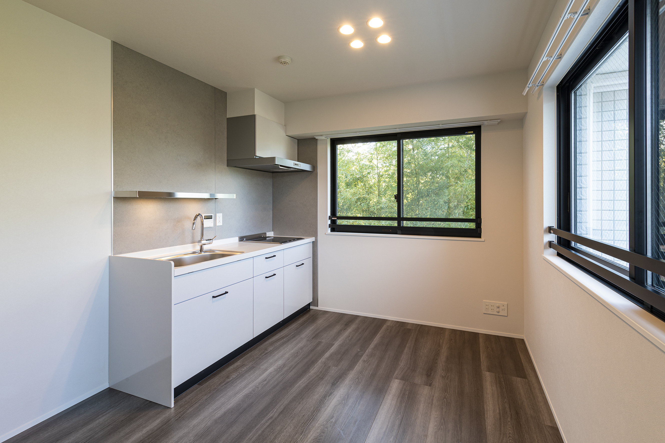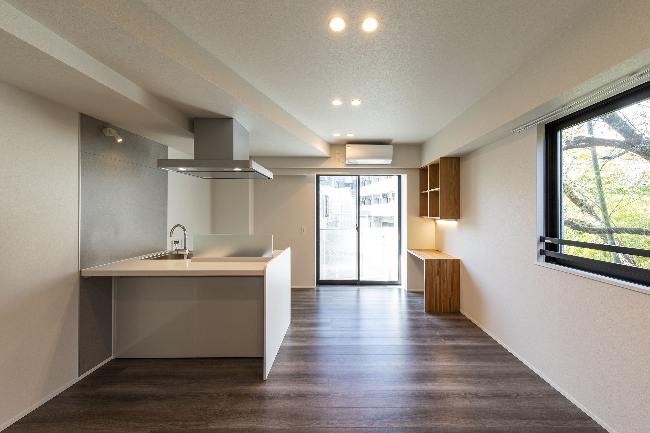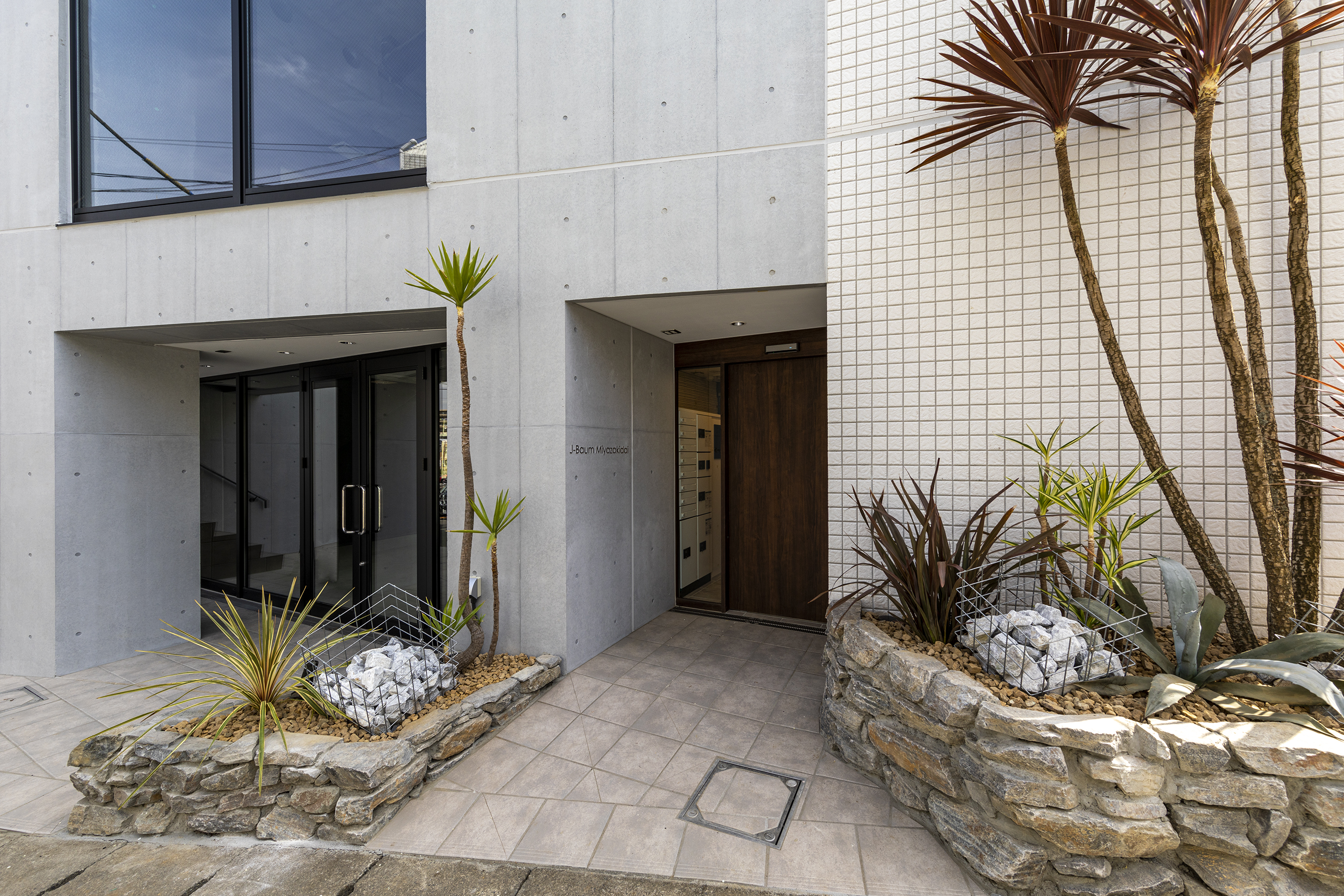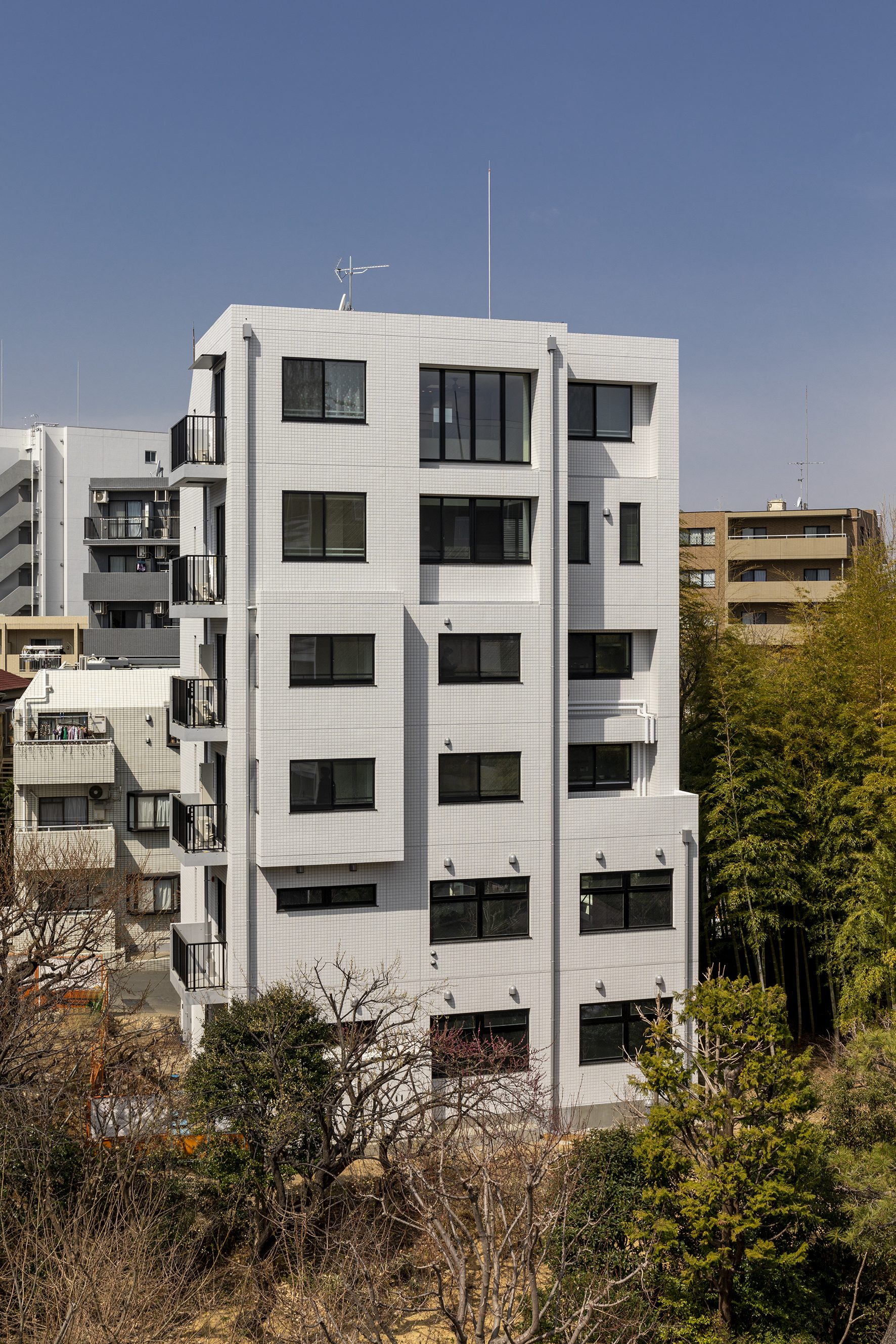東急田園都市線「宮崎台」駅から徒歩2分の場所にオーナールーム付店舗併用賃貸マンションが竣工致しました。1.2階が店舗、3.4階は1LDKの賃貸住宅を配置。計画地は街中にありながら、広大なお庭と北側には竹林と緑豊かな場所でした。その特徴を活かし、緑の映える建築工事を心掛け各居室には既存の竹林やお庭を借景にした大きな窓を設けています。日中には優しい木漏れ日が差し込み、清々しい空気を感じる心地よい空間となっています。