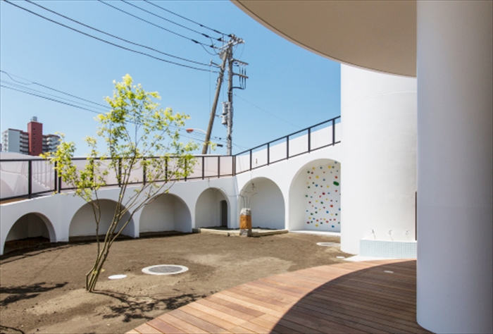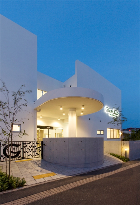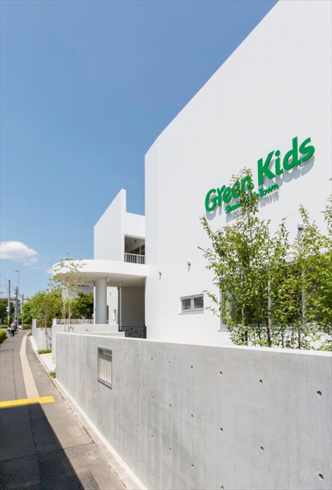 一見すると保育園に見えない真っ白な外壁に、園のカラーでもある緑色のサインが特徴的な園舎が、ベッドタウンの中に存在感のある建物として完成しました。