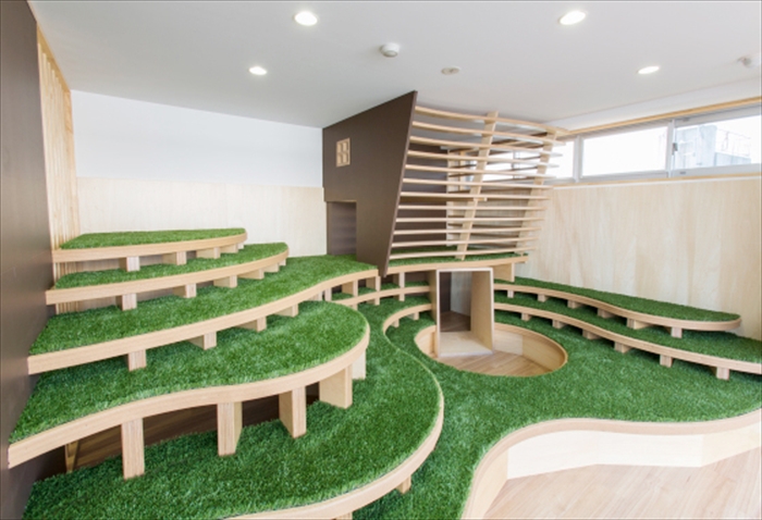 内部も園児が楽しんで活動できる遊び心あふれたスペースが随所に考えられています。室内にある木製遊具もそのひとつで、園児やお母さん達にも大変好評とのことです。