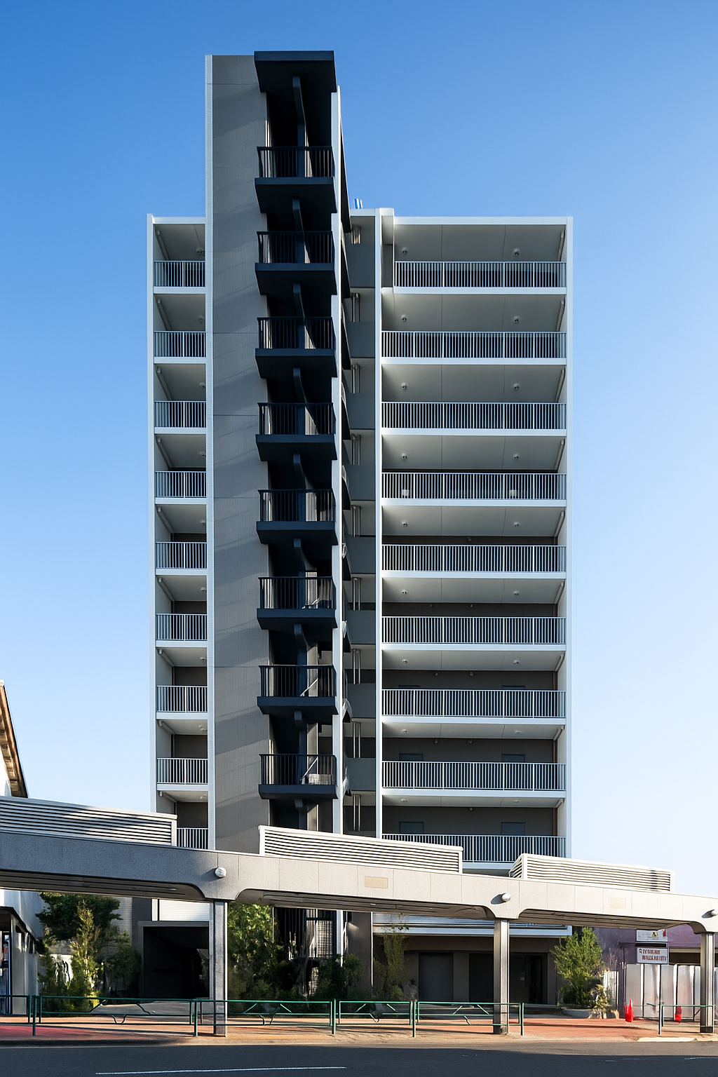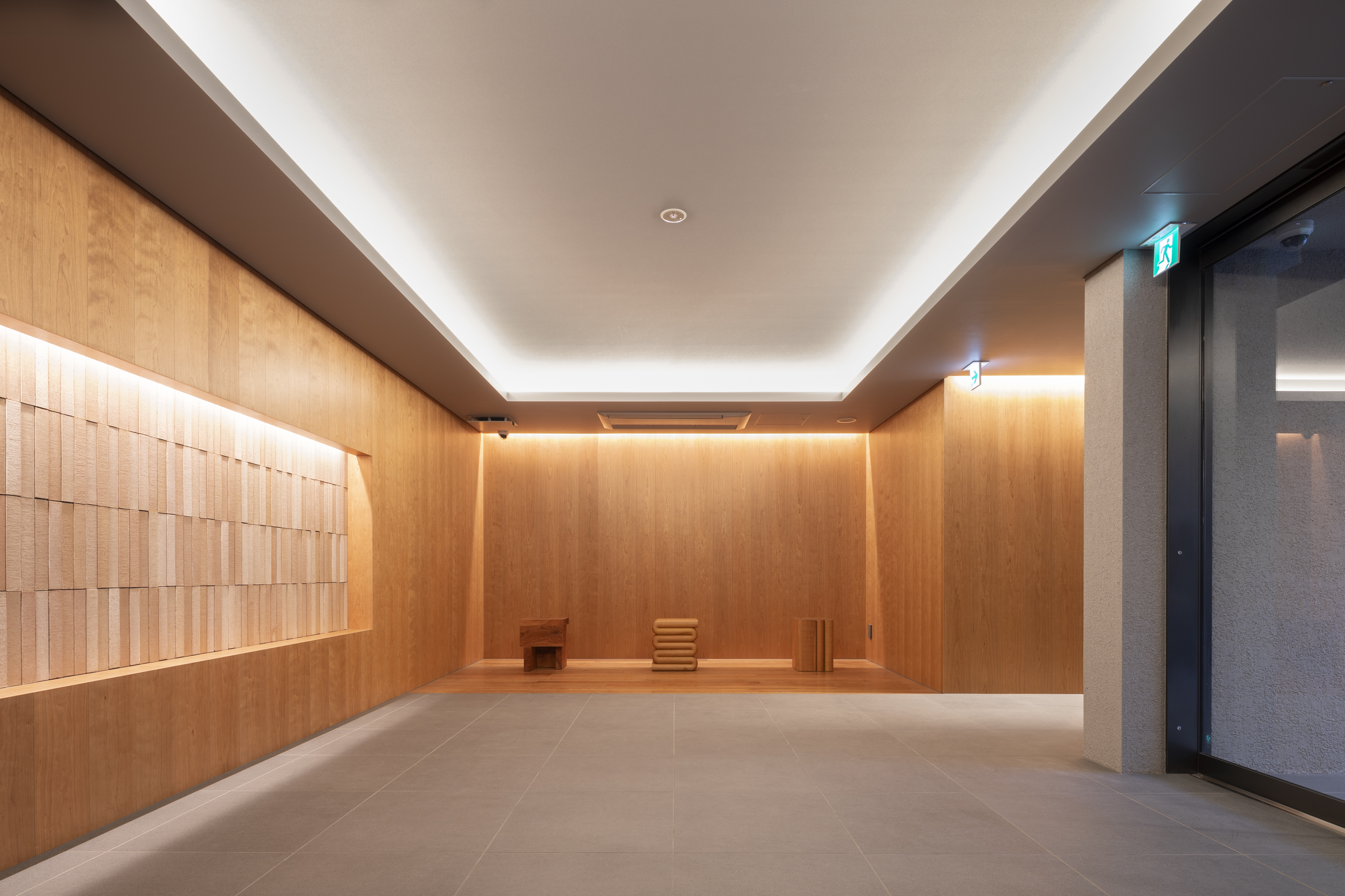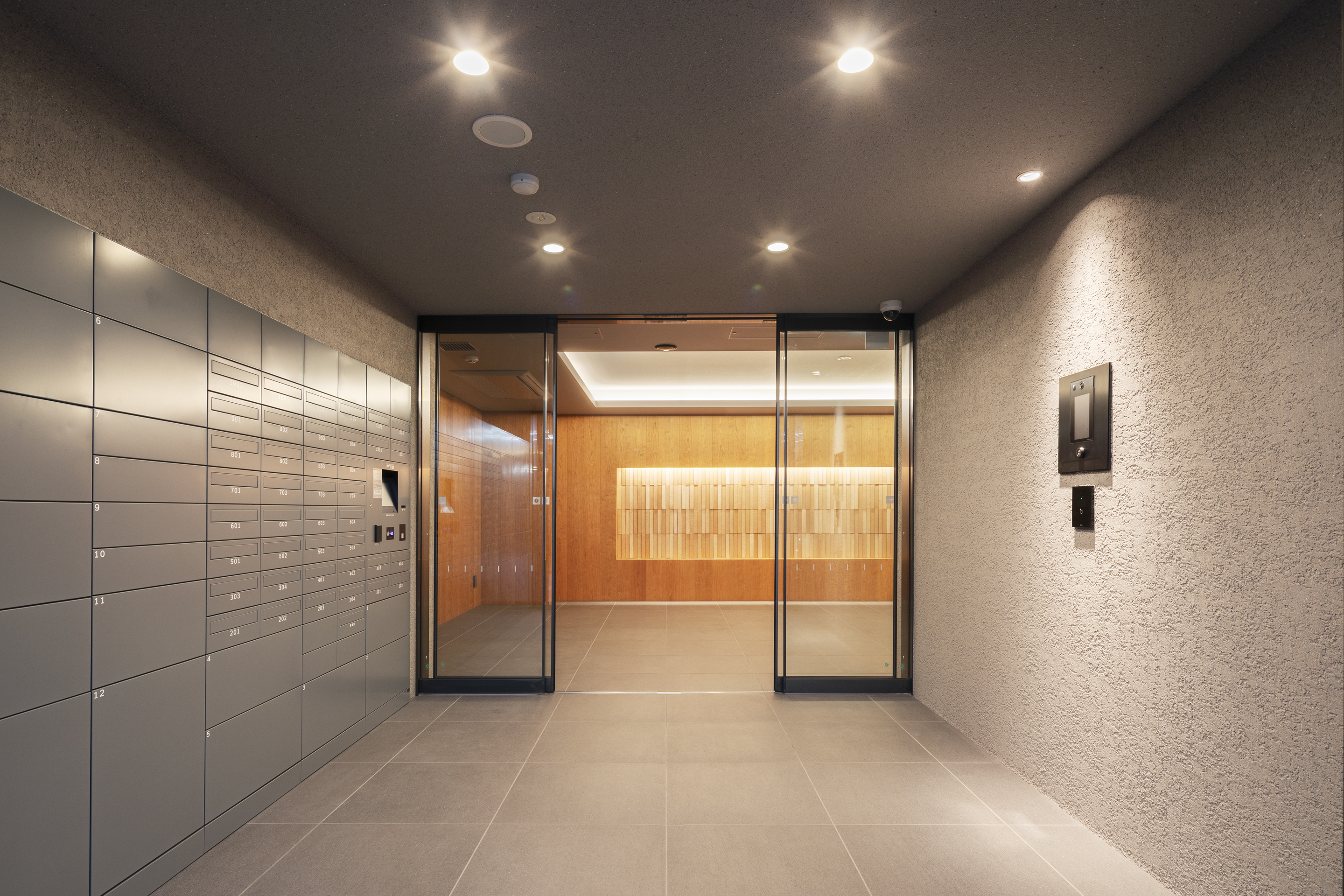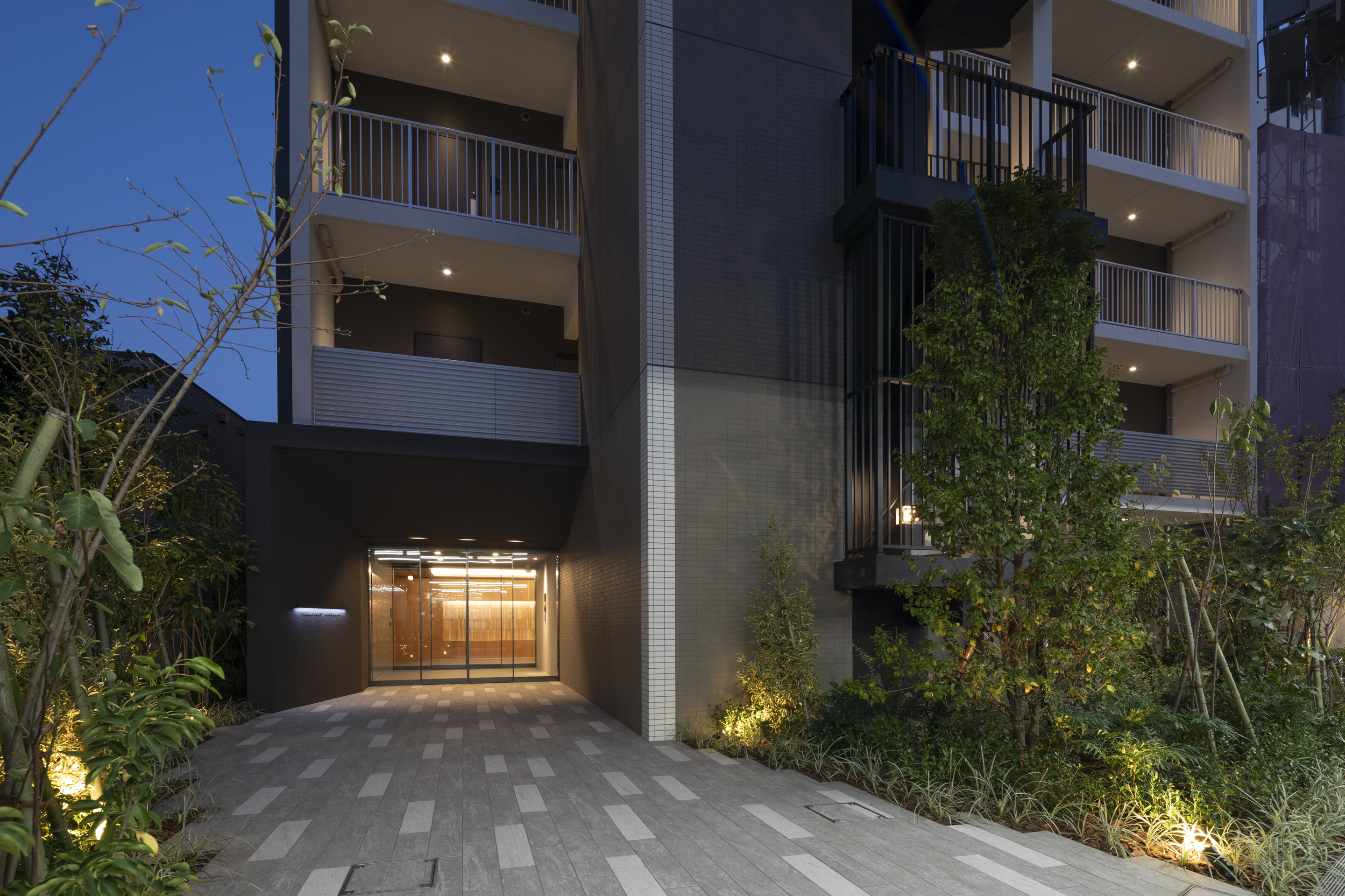 外観は都会の景観と調和するモダンスタイルのモノトーン建築とし、木々のあたたかみを感じられる洗練されたエントランスに仕上げています。