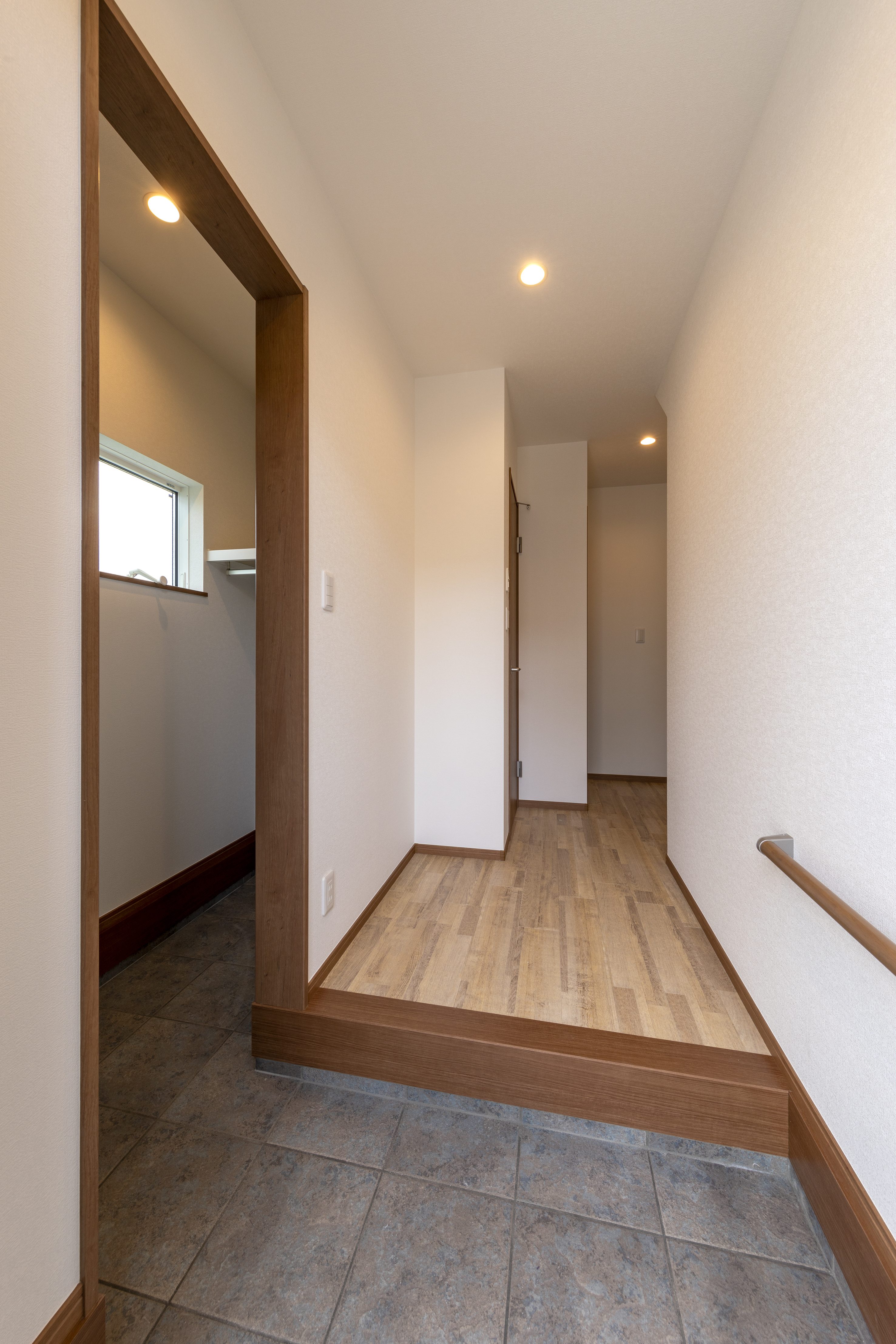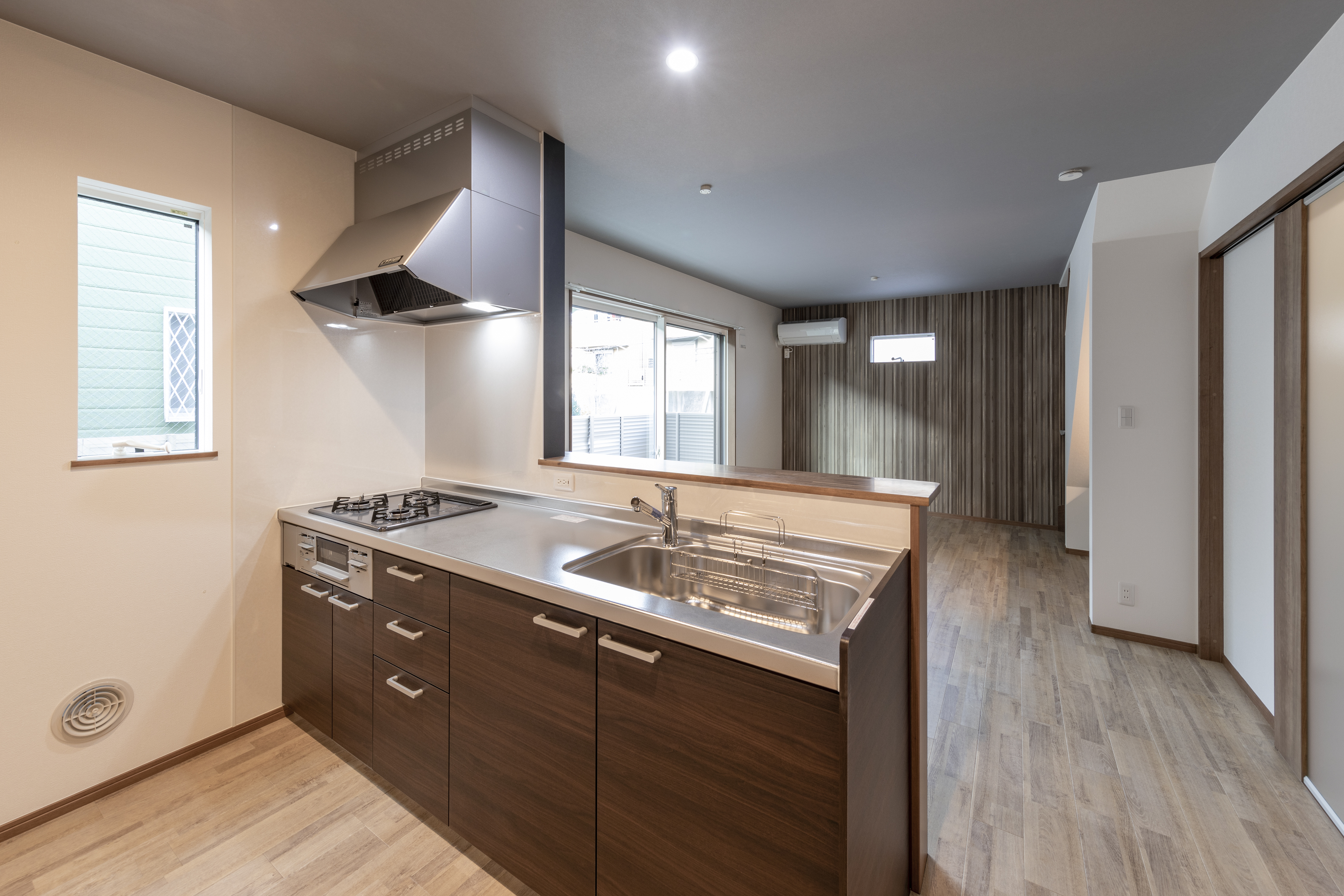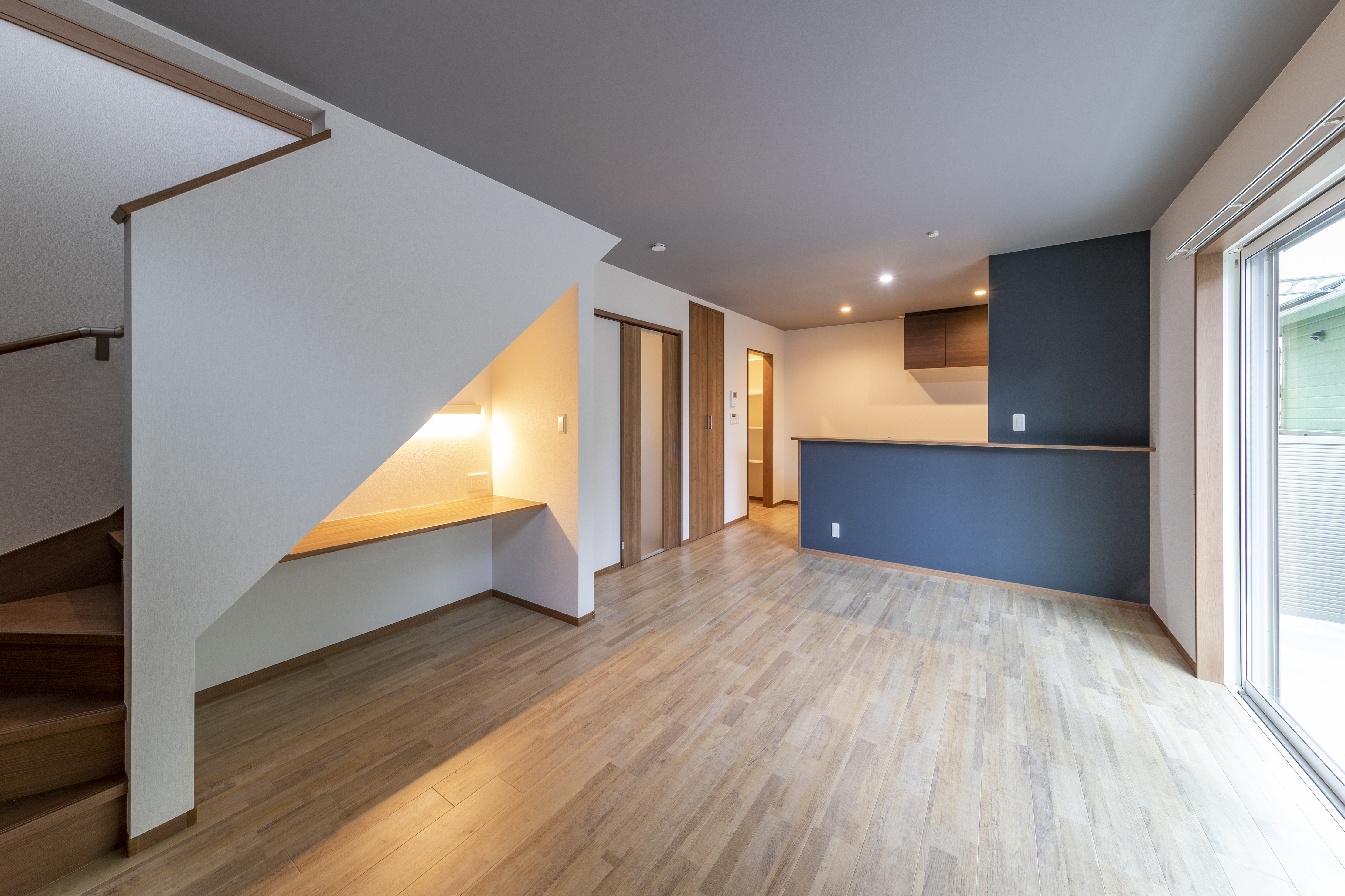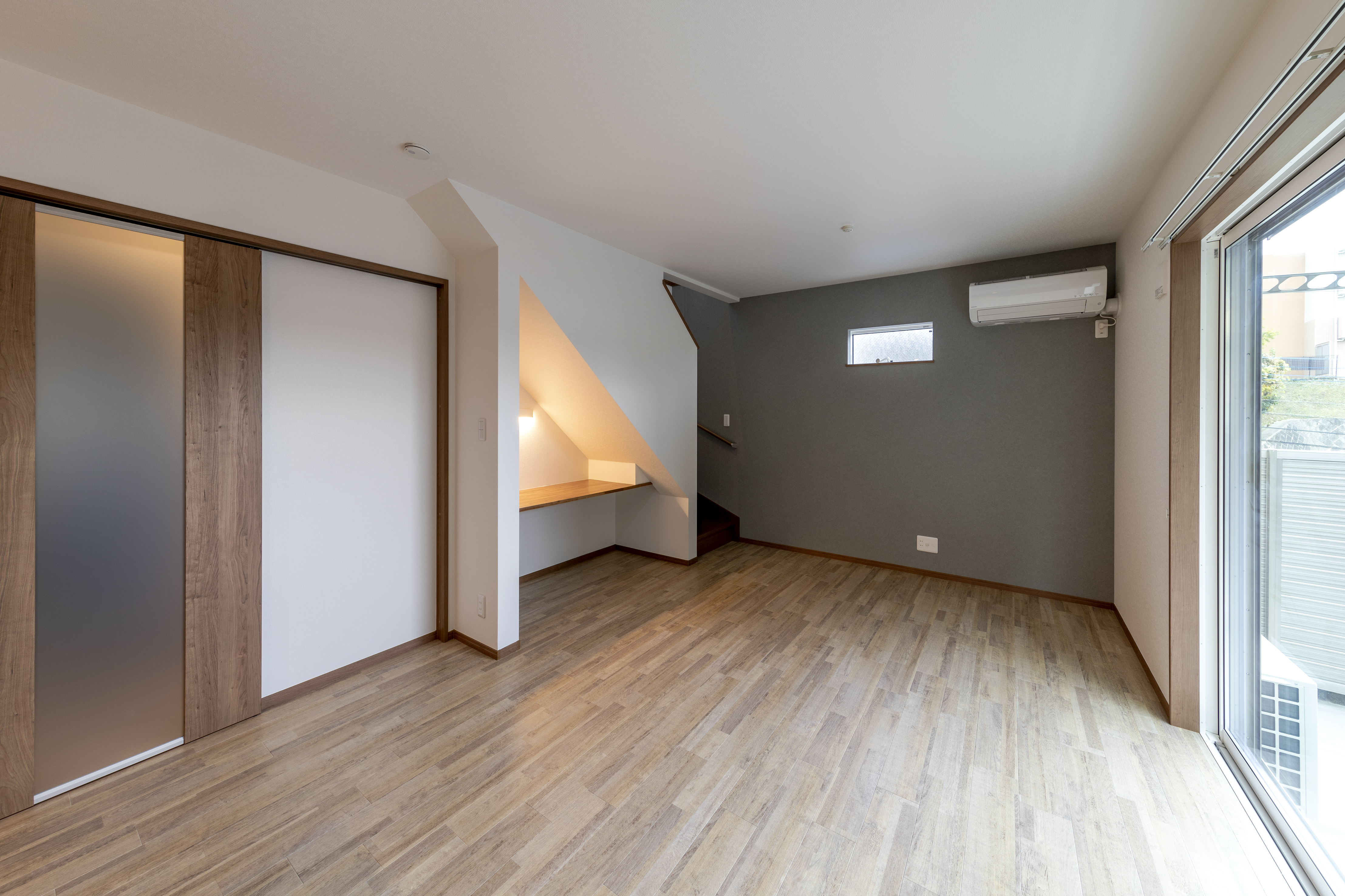 月極駐車場だった土地を活用して、ご自宅+賃貸住宅のテラスハウスを施工。周辺は閑静な住宅地となっております。賃貸住宅は90㎡以上ある大型の3LDKにし、近隣物件との差別化を図りました。玄関は奥行のあるシューズインクロークで靴の収納だけでなく、ベビーカーなどの大きなものも出し入れしやすいゆったりとしたスペースになっております。