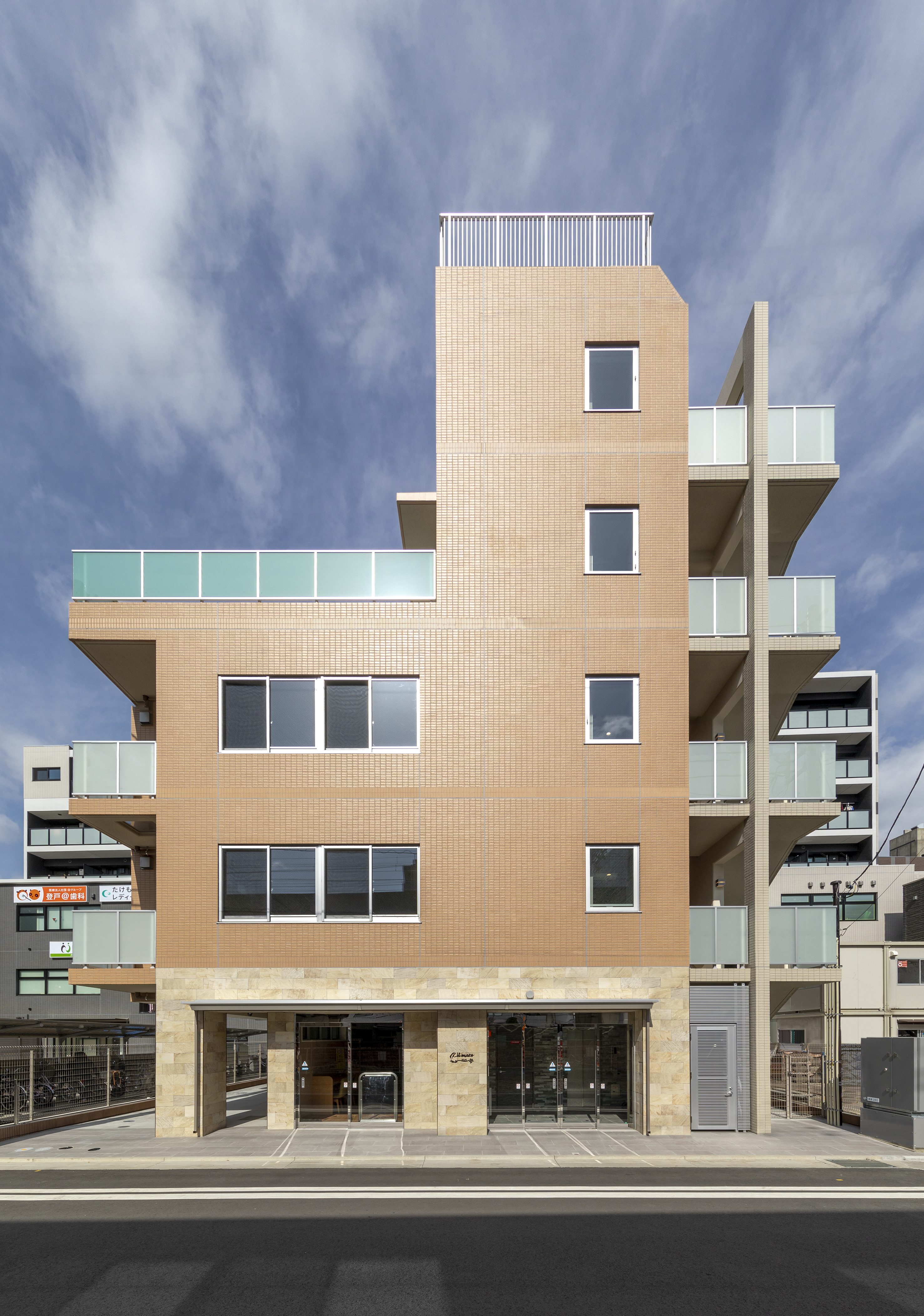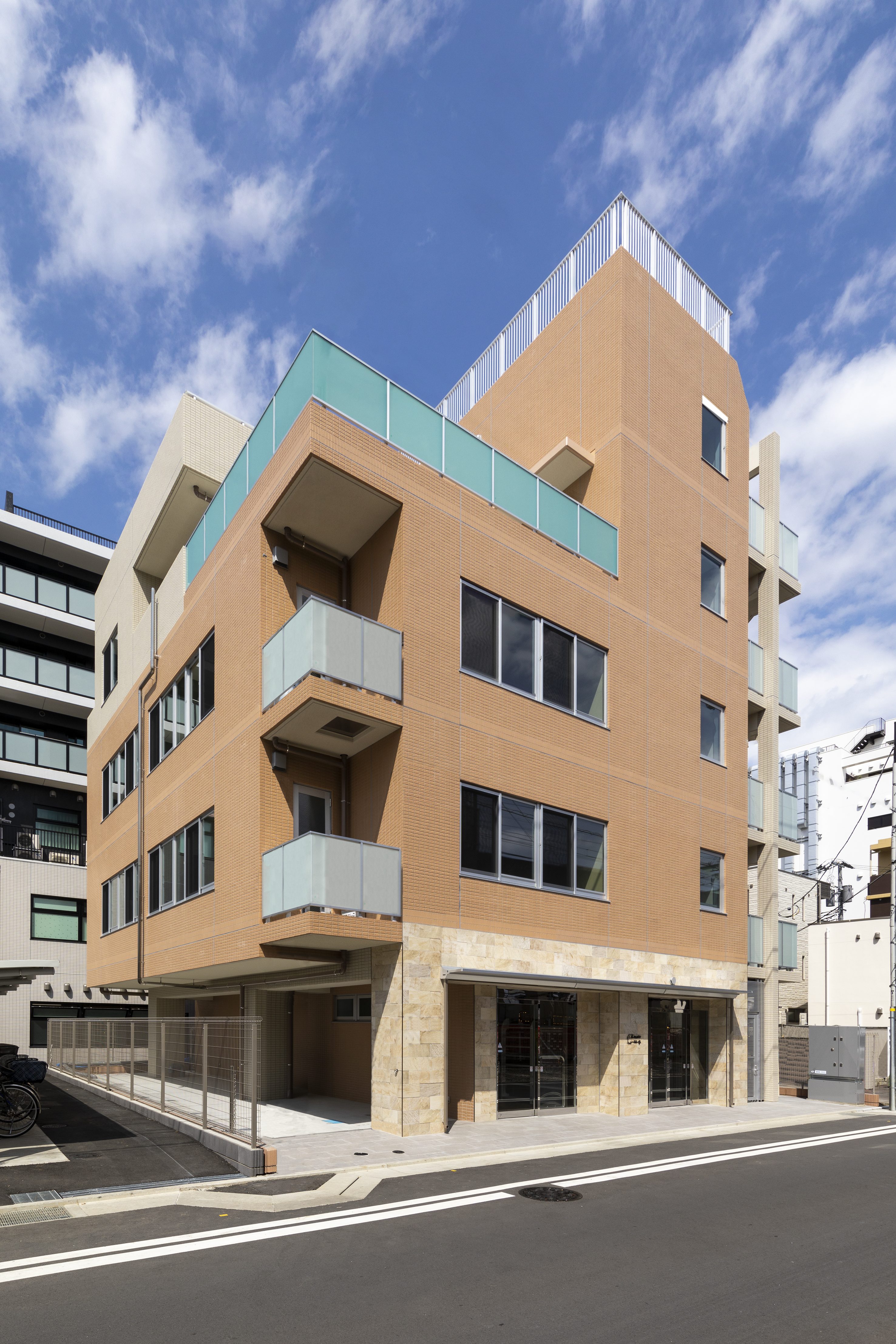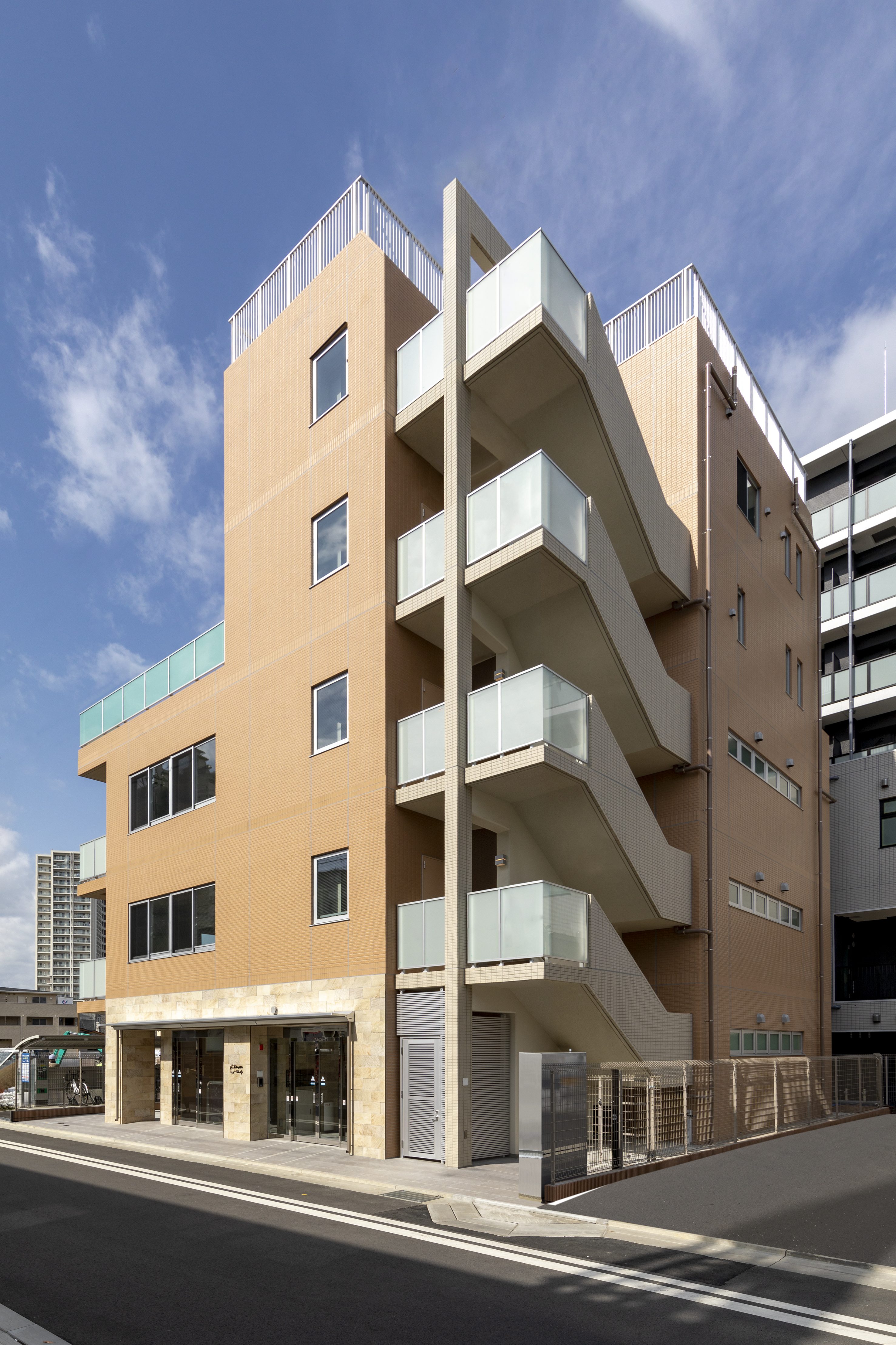 外観は、全面暖色系のタイル張りでまとめています。一部手摺にガラスを採用してさわやかなイメージを作っています。