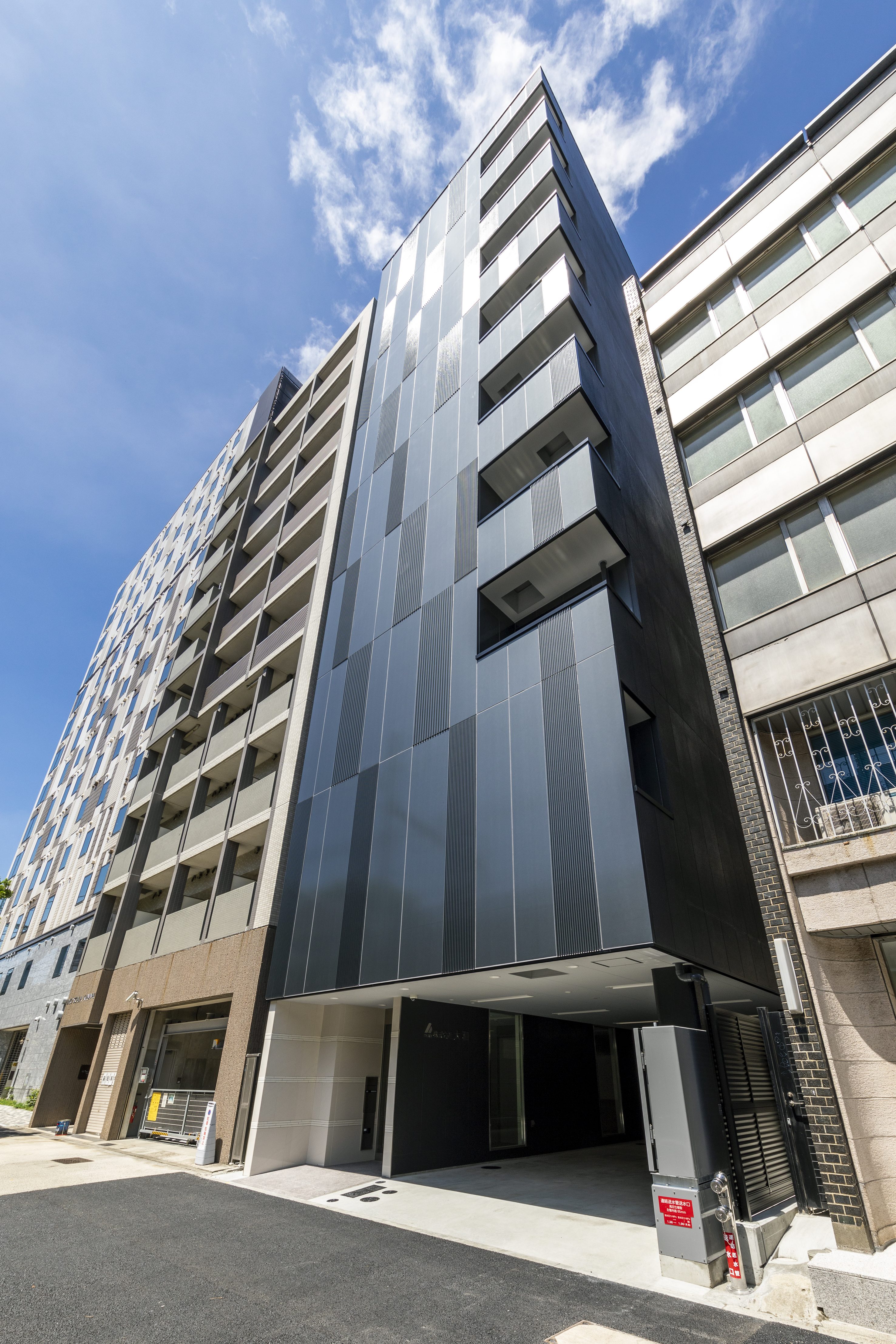 線路沿いで鉄道の騒音対策の為、窓がほとんどないというのが特徴です。また、騒音を軽減する外壁材を使用している点もお客様のこだわったポイントです。外壁材はフラットパネルと幅の異なる凹凸のあるリブすることで同一色でありながら様々な表情を見せるデザインとなりました。光で建物の印象が変わるオフィスビルです。