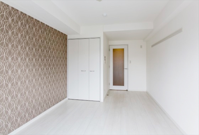 室内にはドア、フローリングなども白を採用した一方で、壁の一面にブラウン系のアクセントクロスで落ち着きのある空間となっています。