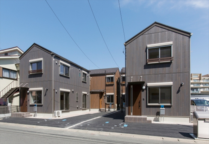 アパートやマンションが多い立地で約100坪の敷地に延べ面積20坪の2階建て戸建賃貸住宅を4棟配置し、希少性のある賃貸住宅が完成しました。
