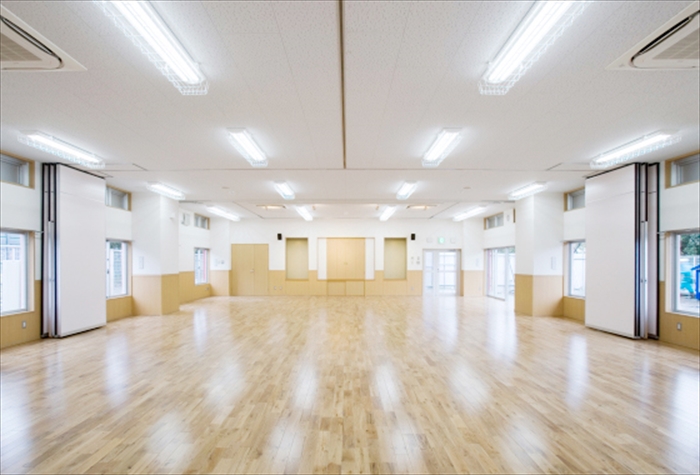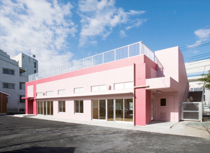 震災を期に講堂部分の建て替えを行い、頑丈な鉄筋コンクリート造で屋上部分も園庭の一部として有効利用できる講堂として建設されました。夏には園児が屋上でプール遊びを楽しそうにしています。